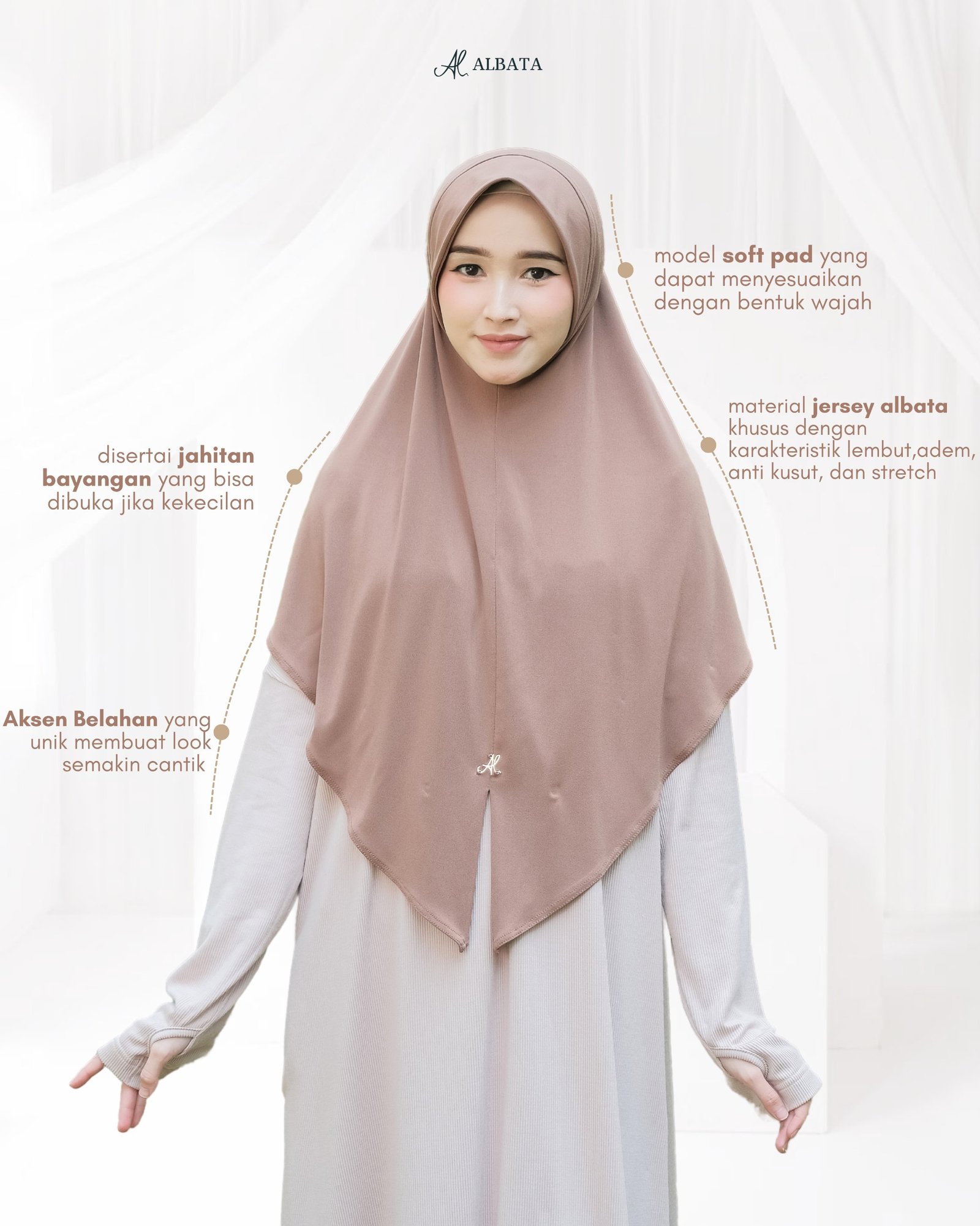 • Pada bagian depannya ada aksen berupa belahan yang unik, looknya sangat cantik jadi terlihat seperti memakai hijab segitiga.